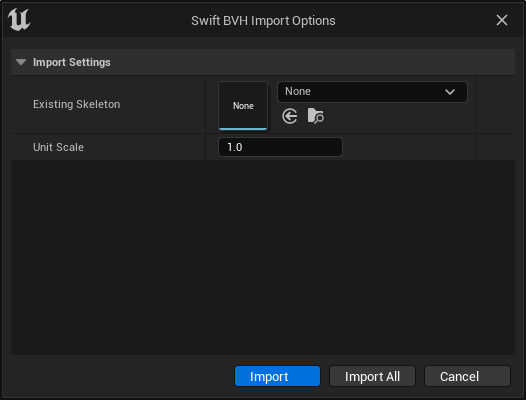 Drag a .bvh into the Content Browser, configure Swift BVH Import Options, then click Import.